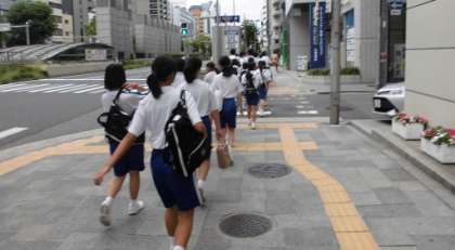 3年生のひとたちが、体操服で長堀通りを歩いていきます。