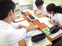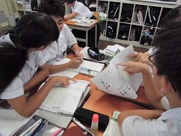 グループに分かれて活動しています。ペアを組み、協力して教科書を読んだり発表の準備をしたりします。テーマは角度をもつ2力を合成する方法について。