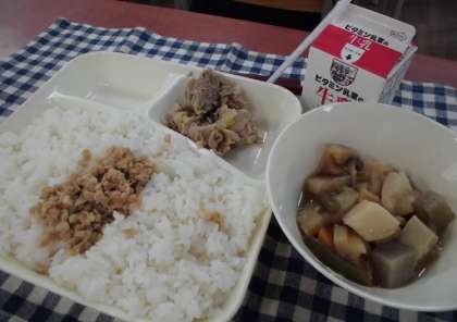 でした。ツナ缶とひきわり大豆がそぼろになっているんですね。不思議な食感です。豚肉、よいお味でした。煮物には、さといも・こんにゃく・れんこん・さんどまめ・しめじがどっさり。今日もよろしゅうおあがり!