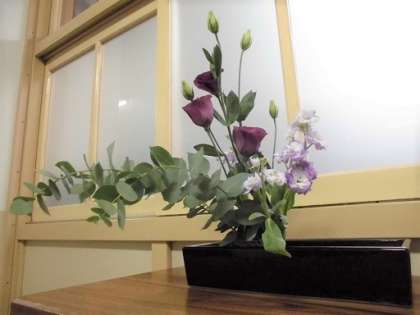 紫のトルコキキョウと、青いお花はストック。ユーカリの葉っぱもきれいです。