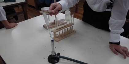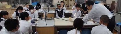 1年2組の授業です。マッチの持ち方、ガスバーナーの使い方、試験管で液体を加熱すること、ろ過の方法など、実験の基礎を学びます。