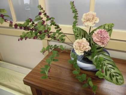 かわいいカーネーションと、みどりのしましまが印象的なカラテアの葉。