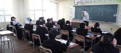 セーラー服のえりは何に役立つか?というお話から、みんな実際に耳のうしろにものをあてて音を聞こうとしている場面です。耳に両手をあてて楽しそう。教科書を使っている人もいますね。ちなみに先生は首がない・・・んじゃなくて、上着のえりをひっぱってます。