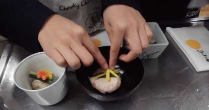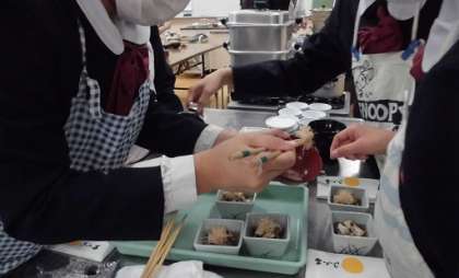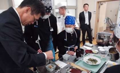 盛り付けます。まるで花束みたいに綺麗です。校長先生もチャレンジしました。