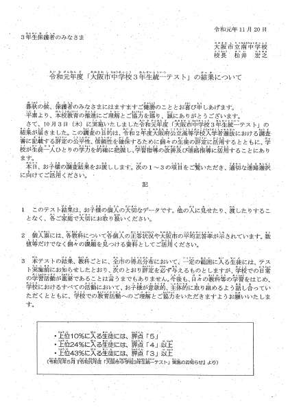 令和元年度「大阪市中学校3年生統一テスト」の結果について