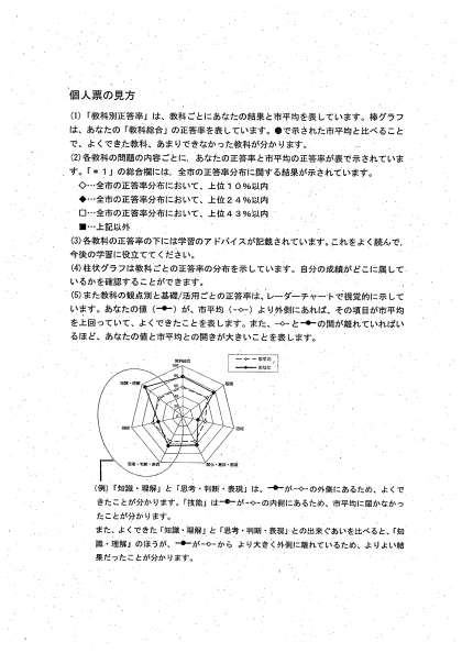 というお手紙を3年生の人たちに配布しました。10/3木に実施した統一テストの調査結果と一緒にお渡ししています。個人票の見方などが記載されています。2枚目にあるレーダーチャートがそうです。