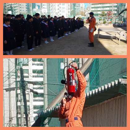そして、また戻ってきて消火器で初期消火を行いました。(生徒の皆さんはそれを見ているわけではありませんが、実はそこまでやっているのです)