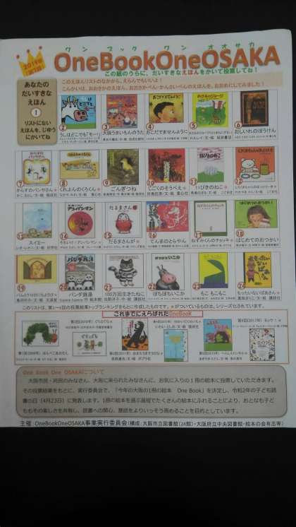 大阪市立図書館などを中心としたOne Book One OSAKA事業実行委員会が、お気に入りの絵本の投票を受け付けています。(12月25日しめきり)