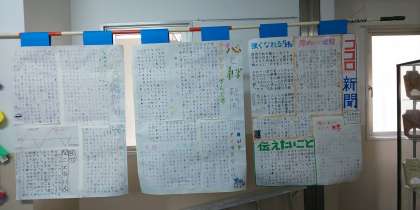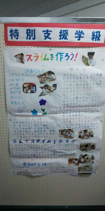 写真は2年生家庭科のお弁当新聞、1年生の障がい者学習のまとめの壁新聞、特別支援学級の実験のまとめです。