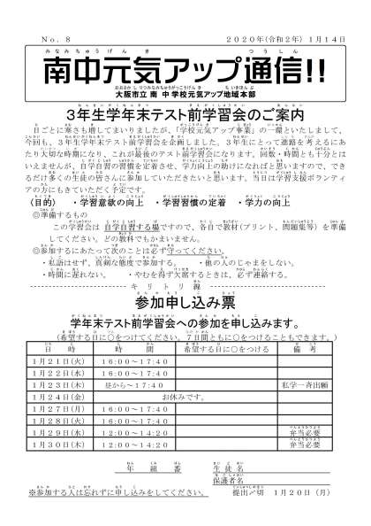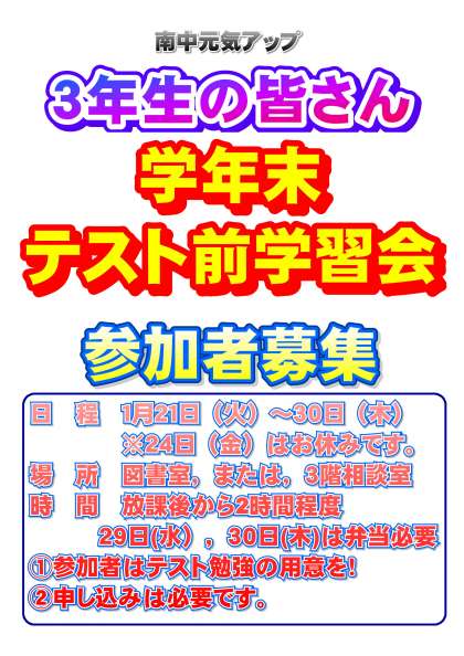 3年生の皆さんへ 学年末テスト前学習会のお知らせ