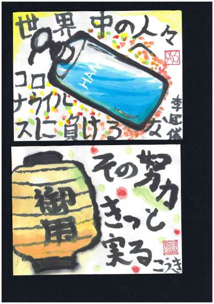 写真は3年生が先週の美術の授業で描いた絵手紙の作品です。