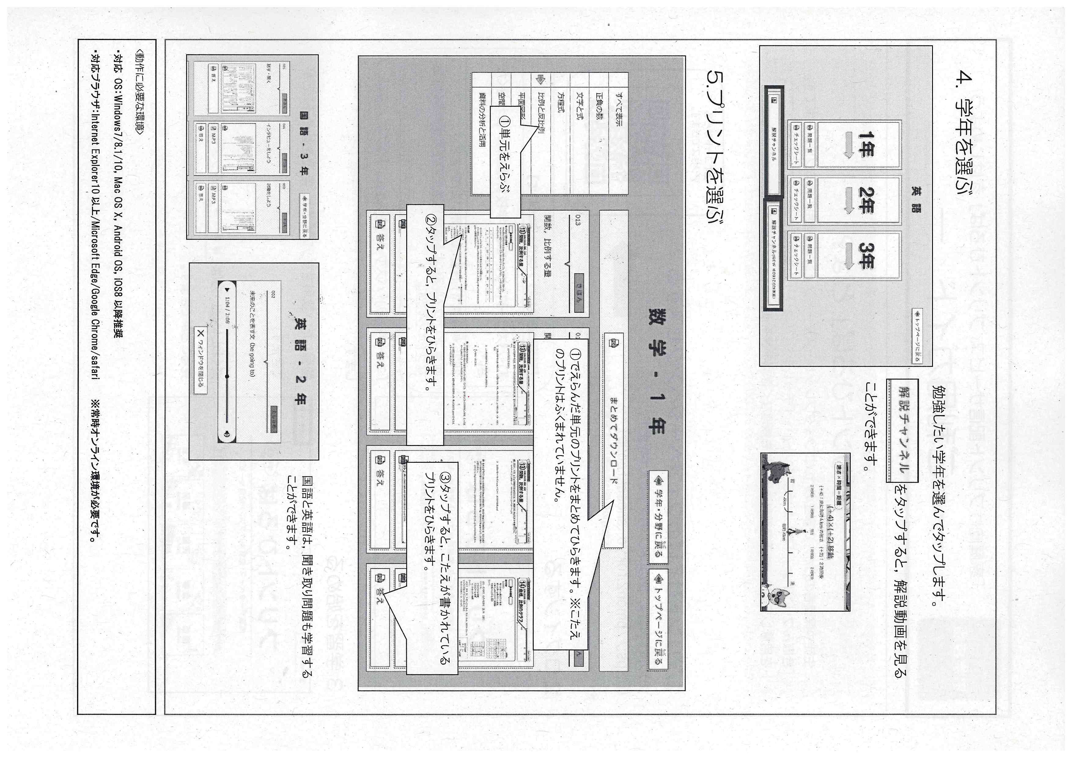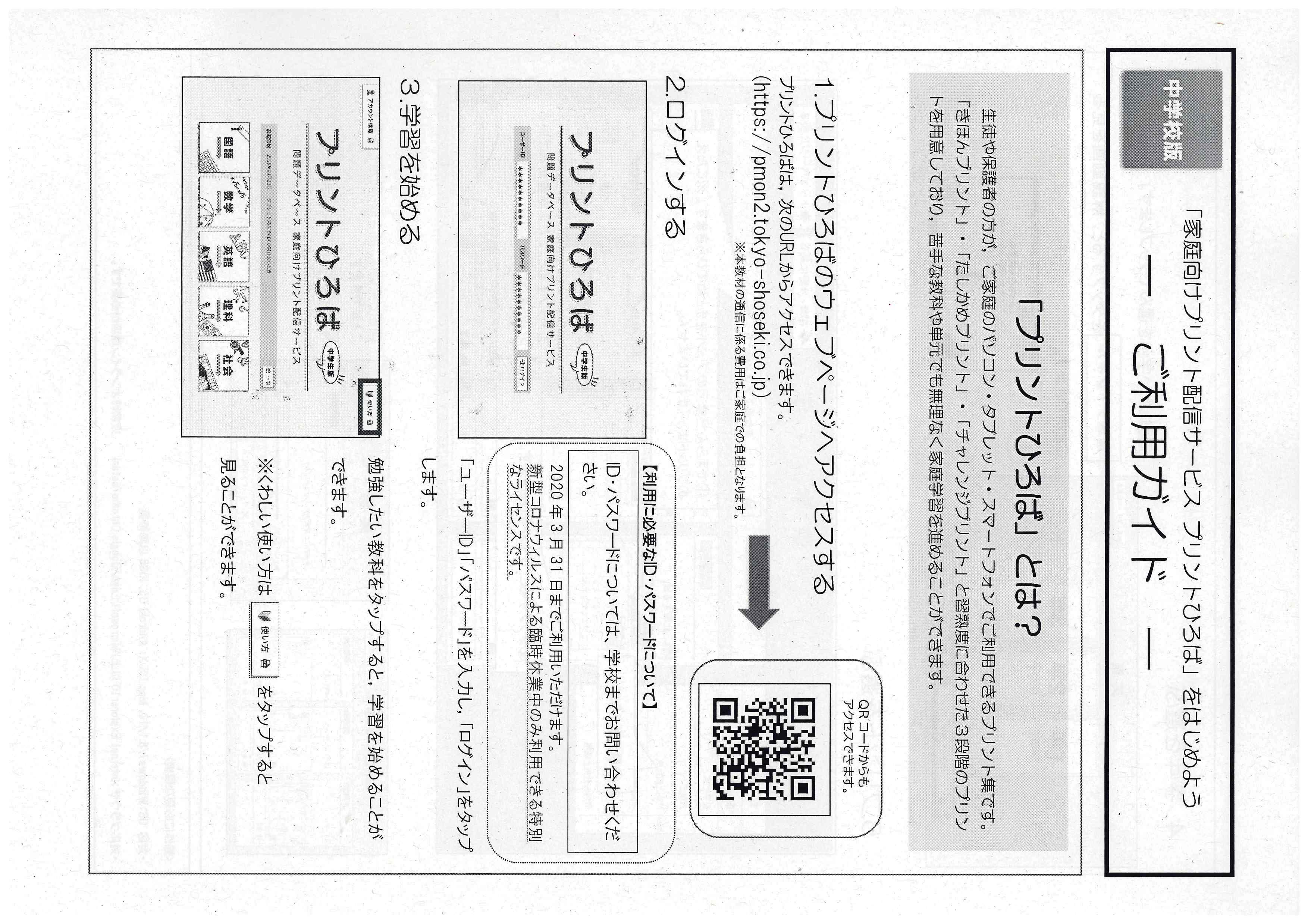 つきましては、担任より配付しております課題に加えて、必要なご家庭は添付しております「ご利用ガイド」を参考にご活用ください。なお、利用にはユーザーIDとパスワードが必要です。学校までお問い合わせください。
