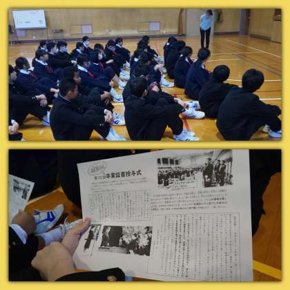2年生は学年集会で、生徒会会長が卒業式のようすを報告しました。