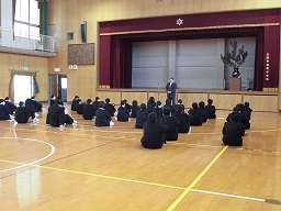 1年生のひとたちは、体育館で先生のおはなしに傾聴しているところです。
