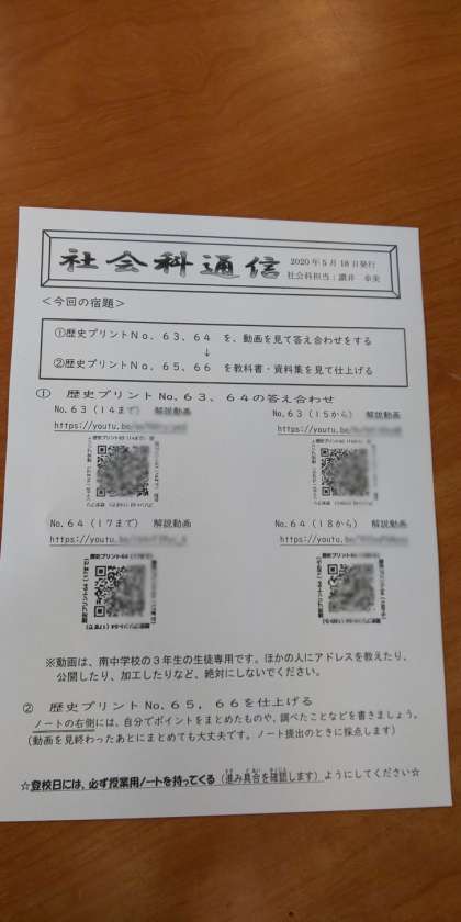 長い間、授業ができていません。少しでも学習内容の理解に役立つようにと、動画を作成して生徒の皆さんにQRコードを配布したりと、各教科色々な工夫をしています。