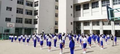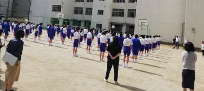 晴れたので、グランドで行うことができました。校長先生の挨拶のあと、新転任の先生の紹介がありました。