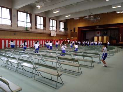 あいにくの雨でしかも入学式の準備で椅子が並んでいる中での体育です。