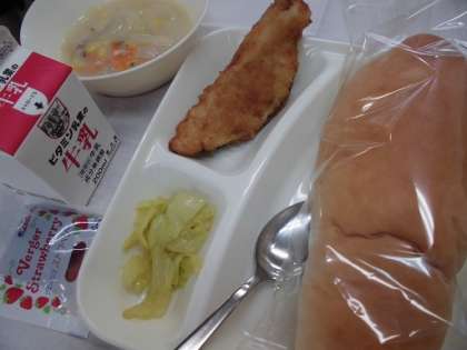 ・ コッペパン、いちごジャム、牛乳