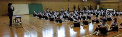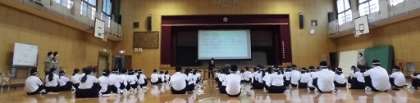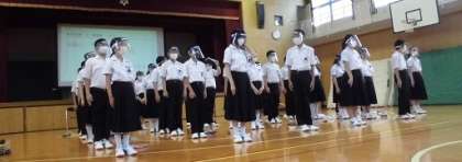 まず最初に、先生から全体にお話です。学校生活での基本的なことを学んでいきます。フェイスシールドも装着OK!そして、このあと・・・