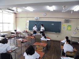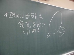 指名された2人が発表をおこないます。黒板に葉の図をかいて気孔について説明しています。そんな理科の授業の場面でした。