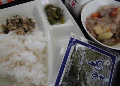 でした。ツナでおいしいふりかけごはんに変身。焼きのりのパッケージは、のりの産地が学習できる日本地図つきというスグレモノ。こいつぁ給食時間も地理の勉強だ!よろしゅうおあがり!