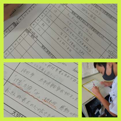 授業の終わりの1~2分をもらって書くのですが、間に合わない時は、ちょっとしたすきまの時間に書いたり、終礼で教えあったりします。