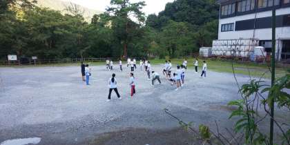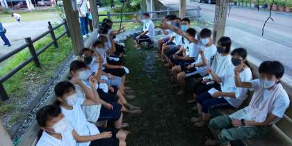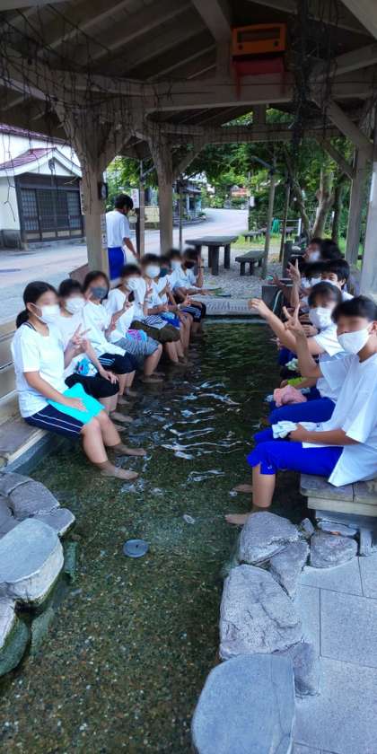 早く集合できたので、足湯へ行きました。クラスごとに交替で入りました。