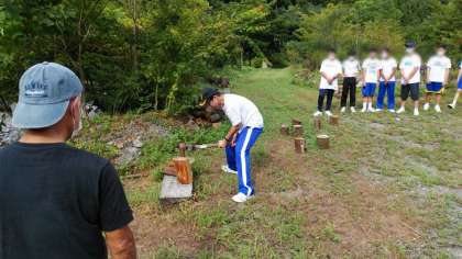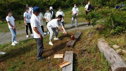こちらのグループはピザを焼いて食べるのですが、その焼くためのまきを割るところから体験します。