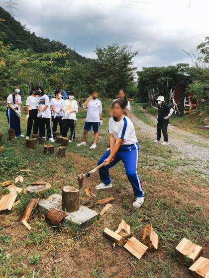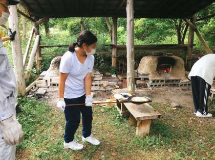 修学旅行、薪割りピザ体験