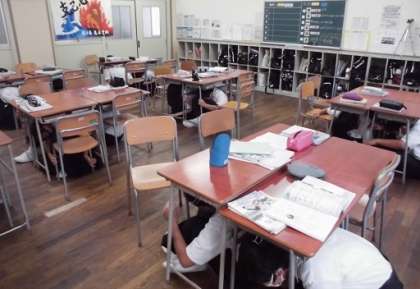 今朝、南中学校でも訓練をおこないました。写真は教室のようすです。警告音と放送を聞いて、授業を中断。みんな、机の下にかくれて、頭をまもっています。この訓練で学んだことを生かしていきます!