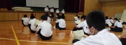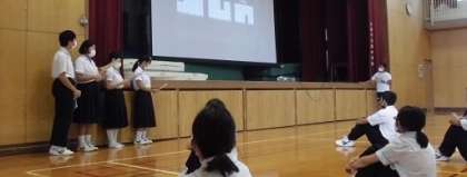 今朝の集会は、生徒会執行部のひとたちから、体育大会の生徒会種目についてお話がありました。プレゼン画面を見つつルール説明を聞きます。配布されたプリントも読みます。毎年オリジナルの種目を生徒会の人たちが企画してくれます。たのしみですね。