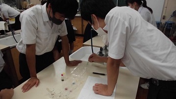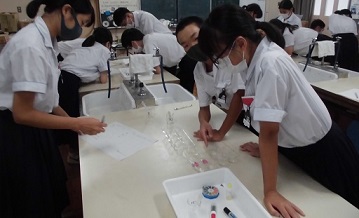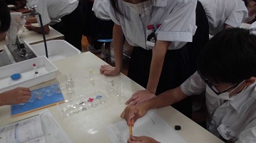 写真は3年生の理科の授業です。酸性・アルカリ性の水溶液の性質をしらべています。試薬の色がきれいにでました。みな熱心です(ひとりだけカメラ目線ですね)。