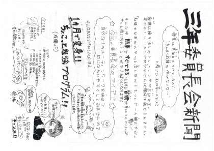 また、今日の3年生学年集会では、委員長会が作った「三年委員長会新聞」を配布しました。学年全員の学力向上のための渾身の力作です。ご家庭でも読んでいただいて、これを機に学習や進路について話し合っていただけたらと思います。