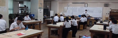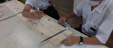 さしがね を使用して寸法通りに材料をはかり取ります。コツがあるようで、相談しながら実習しています。先生の指示をよく聞いて、うまくできました。