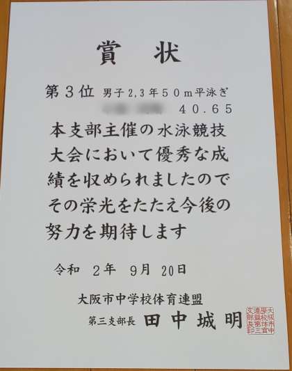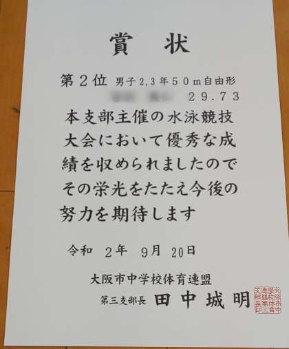 第3支部の大会で、自由形で2位、平泳ぎで3位という成績をあげました。