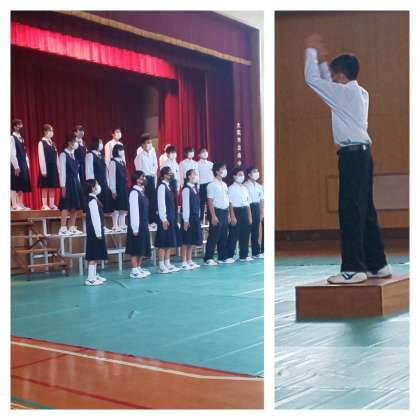 今年はコロナ禍のため、練習時間は短かったです。それどころか1学期は歌は歌えない、笛も吹けない状況からのスタートでした。フェイスシールドをつけての音楽の授業、やがてマスクで同一方向を向いて歌えるようになってきました。