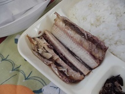 骨つきのサンマをいただきます。背骨をとりのぞいて、きれいに身をたべられるようになってますね。南中学校には、お魚のたべかたが、じょうずな人が多いのです。