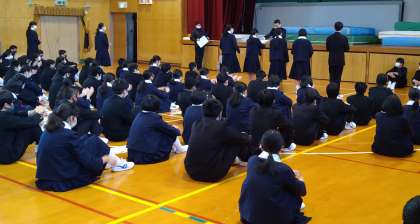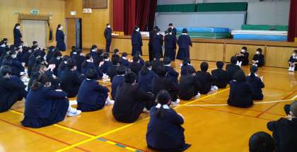 中学校では珍しい体操部の大活躍です。優勝をはじめ、ひとりいくつもの賞をもらっています。2年生1組の女子の列はごそっと抜けているのは表彰されているからです。