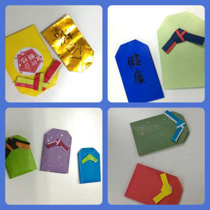 次にお守りの袋は折り紙で折ります。皆一生懸命です。教え合いながら、全員完成しました。