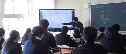 写真は、図形を学ぶ1年生です。投影図について説明を受けているところですね。