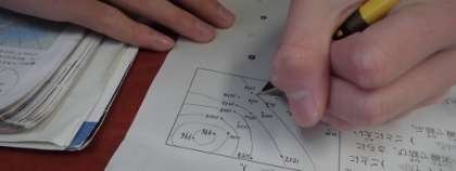 先生から作図方法の解説を受けた後、じっさいに等圧線をひいてみます。わからないところも、机のあいだをまわってきてくださる先生からアドバイスがもらえるので安心です。天気記号を学んで、これで天気図がかけますね。