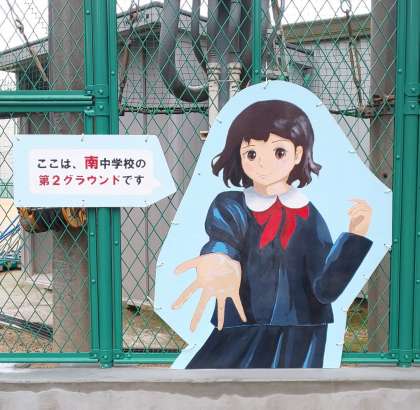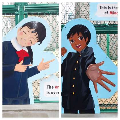 美術部が制作した、男子2名女子2名の絵です。昨年、第2グラウンドのブロック塀が安全のために金網のフェンスに取り替えられたのですが、その途端にゴミを投げ入れられるということがありました。