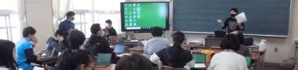 南中学校は今日も元気に活動中です。先生たちは、新学期にそなえて一人一台パソコンを準備しましたよ。はじめてのことも、難しいことも、みんなで勉強して解決するのです。