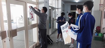 玄関ピロティ入口に部員募集ポスターをはります。たくさん新入部員があるといいですね。
