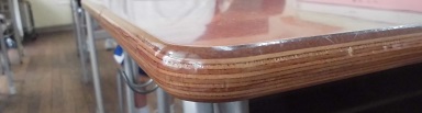 技術科の講義は、木材加工について。教室の机をしらべます・・・何枚の合板でしょうか!?