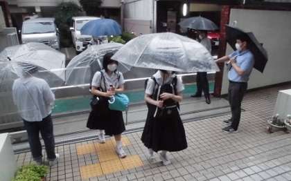 今朝は大阪市に大雨の警報がはつれいされるくらい、はげしい雨のなかの登校でした。(でも、大雨洪水警報では休校にはならないんです。ごちゅういください)。視界もわるくなりますので、みなさん、登下校はじゅうぶんにきをつけてください。