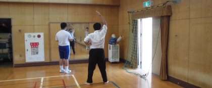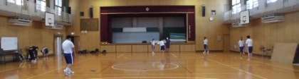 体育館にて、ラジオ体操をみんなでおしえあって練習してマスターします。指先まで、よい動きなのです。