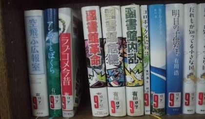 図書室の本棚を見ていきますと・・・おや。内乱、危機、革命ときて、はて、シリーズ1作目「図書館戦争」がありませんね。ははあ。さては、この夏に名作を読破しようとたくらむだれかさんに貸し出されたにちがいありません。いまごろどこかでハラハラドキドキキュンキュンしているわけですね。