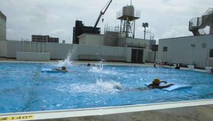 本日・午前中は晴天にめぐまれております。まぶしい日差しのもと、水泳部のれんしゅうです。