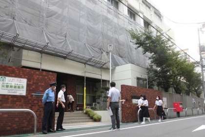 たくさんのひとに見守られ、南中学校生たちが登校です。